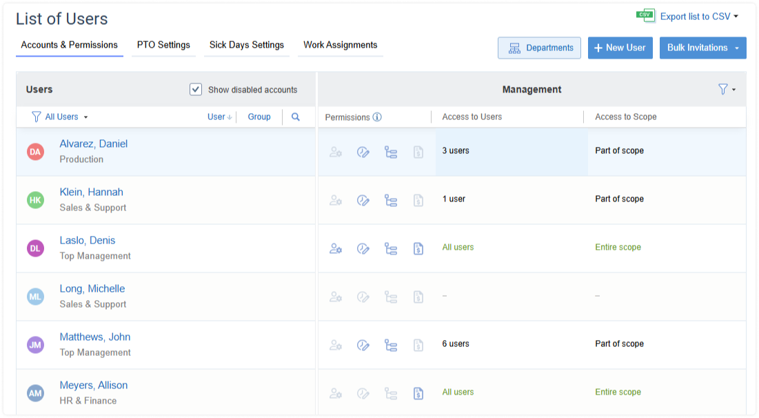 - Invite new users in bulk – This option requires you to fill out a simple bulk invitation form with basic user data (e.g., names, emails, permission templates). It speeds up the invitation process, yet if you need to add more info to users’ accounts (e.g., their hire dates and time zones), you will have to do it manually afterward.